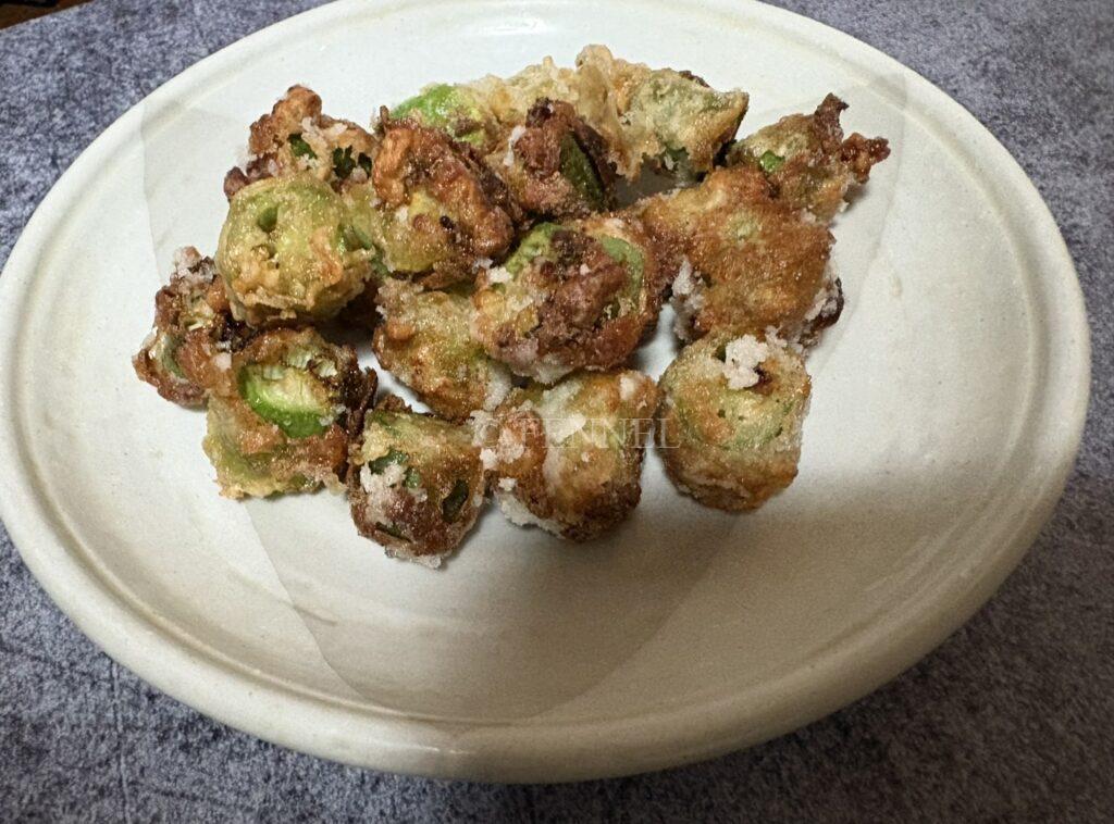 ➁にカットしたおくらを入れて、170℃の油で揚げる。浮いてきたら取り出す。